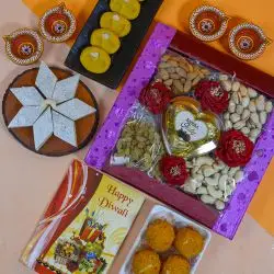 This Diwali Gift Box has:� Almond Peri Peri In A Jar- 100 gm� Mewa Fudge Bite -3 pcs� Orange Fudge Bite -3 pcs� Butter Scotch Fudge Bite -3 pcs� Ferrero Rocher- 4 Pcs� Gold Coin Shaped Chocolate� Designer Pearl T-Light Candle - Set of 2� Designer Festive Reuseable Mandala BoxCelebrate the spirit of Diwali with our festive feast gift box. Indulge in the deliciousness of Kaju Katli and Milk Cake, and let the luscious Cadbury Dairy Milk Silk tantalize your taste buds. This gift box is a true delight for Diwali enthusiasts who want to treat themselves to an array of mouthwatering flavors and make their festivities truly memorable.