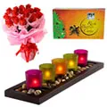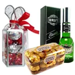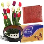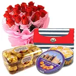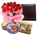 Make your new year celebrations grander with this Entertaining Combination of Happy New Year Gifts that instantly rejuvenates everyones mood. This is a perfect combination of 1 Box of 16pcs Ferrero Rocher Chocolates, 1 Tin of Danish Cookies, a Bouquet of Artificial Flowers and a Gents Wallet.